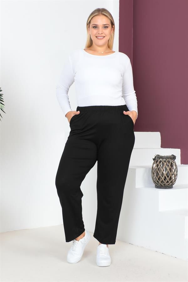 Penye Pantolon Yüksek Bel Cepli Likralı Büyük Beden